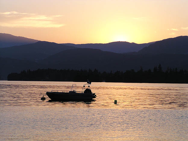 Zwei sehr unterschiedliche Bilder vom Wörther See in Kärnten. Boot kurz nach Sonnenuntergang