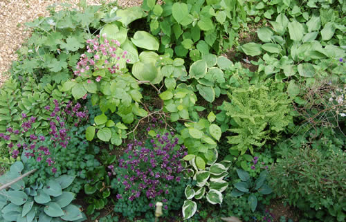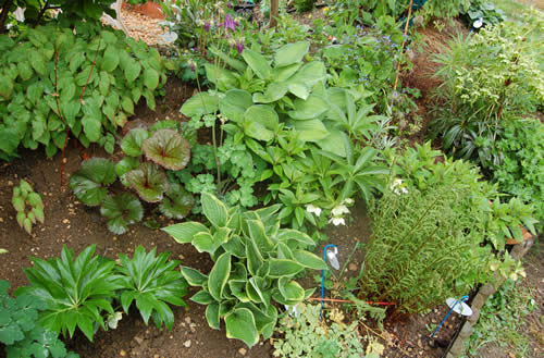 Hier noch eine Kombination mit zwei von 6 sichtbaren Hostas: Kaukasisches Vergissmeinnicht, Farn, Storchenschnabel, Helleborus, Akalei, Niesswurz, Elfenblume, Schneefelberich, Clematis am Stab und eine unbekannte Blattpflanze.