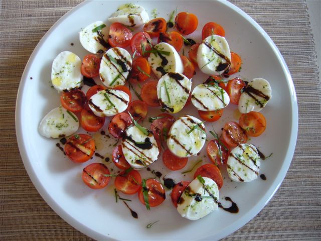 heute gab es:Tomaten mit Mozzarella di Bufala, dazu ein Olivenbrotzum Schluss: Wassermelone