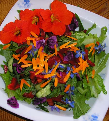 Ganz klasisch - vom Rest der Familie mal wieder gewünscht - gab es heute Wurstnudeln,dazu Schnittsalat mit Blütenblättern aus dem GartenLG