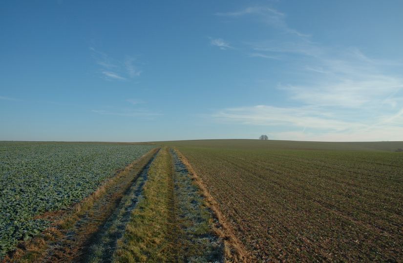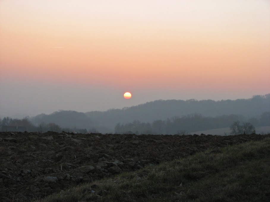 Um die Sonne untergehen zu sehen hab ich in der Kälte ausgeharrt und mir dafür eine passende Umgebung erwandert. Vorbei ging es an umgepflügten Äckern und Rebhängen und die Bank im Hintergrund konnte mich bei den herrschenden Temperaturen nicht zum Hinsitzen bewegen.