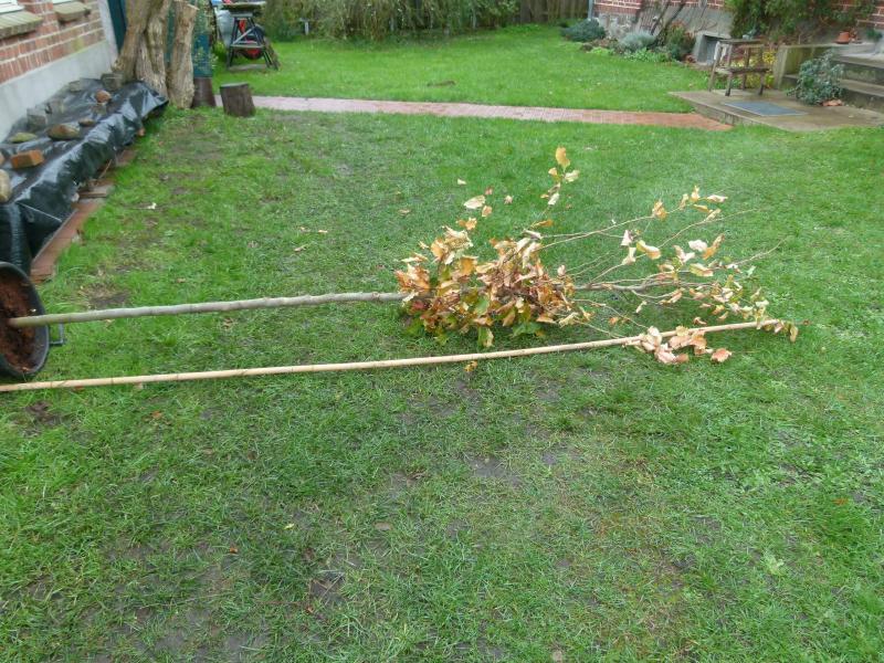 Dankeschön, Gartenplaner. Ich achte darauf, dass es nicht einwächst. Gummiummantelten Draht habe ich natürlich. Von der Baumschule wurde mir interessanterweise ein Streifen T-Shirt-Jersey dafür mitgegeben. Scheint also auch zu funktionieren, das merke ich mir. Der Stab ist nun ja eingekürzt, dann müsste ich den mit einem weiteren, dünneren Stab anlängen.