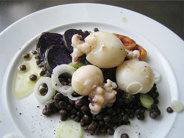Kleine Tintenfische auf Belugalinsen, mit violetter Kartoffel und Chorizo.Leider ist das Bild zu dunkel. Es hat wirklich gut ausgesehen und geschmeckt.