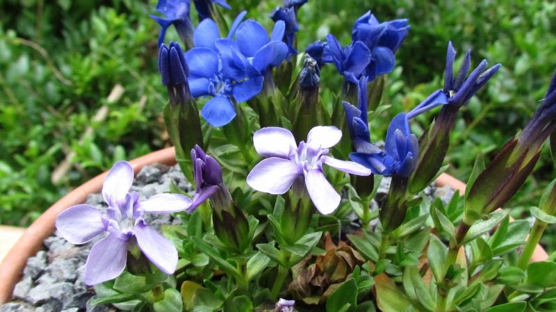 Da sich das mit den Ritterspornen hier erledigt hat und ich aber auf das Enzianblau nicht völlig verzichten wollte, habe ich mir letztes Jahr ein kleines Sortiment ebendieser für meinen Topfgarten geholt. Nur die unkompliziertesten Arten, trotzdem hat es mich bei Gentiana verna var. angulosa sehr erfreut, dass er nicht nur den letzten Sommer mit dem ständig kurz vor dem Vertrocknen stehen überlebt hat, sondern tatsächlich auch wieder blüht!