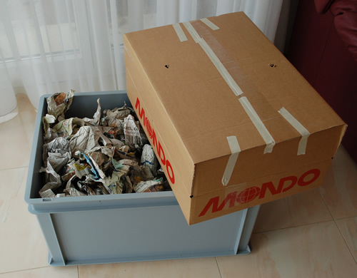 Und los gehts. Meistens gibt es nur ein Art von Futterbehälter, manchmal auch zwei. Hier kommt noch die Zeitungschachtel dazu.