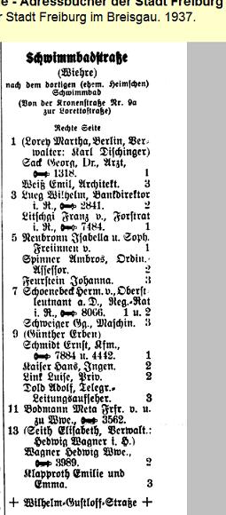 Klammern bedeutet: "Der Erstgenannte eines jeden Hauses ist Eigentümer desselben, wohnt derselbe in dem Hause, so ist dessen Name das Stockwerk beigefügt; wenn nicht, ist sein Name in Klammer gesetzt ()"hier sieht man auch nochmal, daß die Basler Str. in Wilhelm-Gustoff-Str. umbenannt war.Die Elisabeth Seith ist im Adressbuch 1937 auch in der Schwimmbadstrasse 13 vermerkt, der Name steht in Klammern. Was bedeutet das? ...