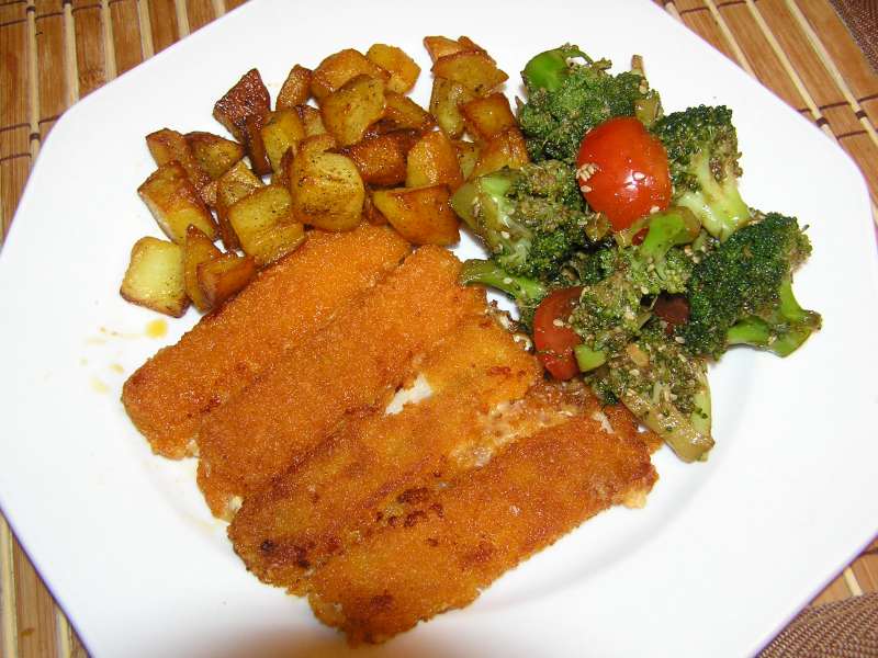 wir hatten fischstäbchen, bratkartoffeln aus rohen kartoffeln und salat aus brokkoli, tomatenspalten und sesam.