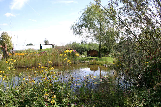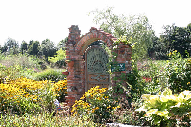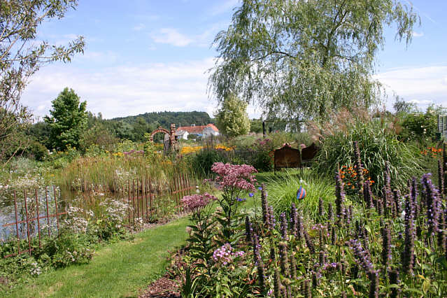 Im Schaugarten ist auch ein Teich, von da aus sieht man nochmal das schöne Eisenbett.