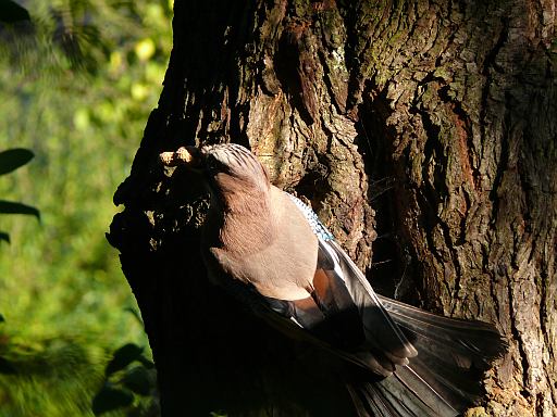 . Die Rabenvögel und Eichelhäher wissen sehr genau, dass es morgens am Pflaumenbaum Erdnüsse zu ernten gibt. Manchmal ist der Eichelhäher schneller und manchmal die Krähen oder Elstern. Die Krähen sind aufgrund ihrer Größe etwas unbeholfen, aber das machen sie durch Nachdenken wett. Sie setzen sich auf das Vogelfutterhaus, legen den Kopf schief und fixieren die Ernuss im Baumloch. Nach einer Weile nehmen sie Anlauf und flattern genau auf das Ziel zu, rutschen ein wenig am Stamm weg, schnappen sich aber zielsicher die Nuss und fliegen z.B. auf das Schuppendach, wo sie ihre Beute aufhacken und verzehren. Der Eichelhäher hat es da wesentlich leichter. Und auch hier habe ich immer den Eindruck, dass sie mich beobachten, wenn ich die Löcher fülle