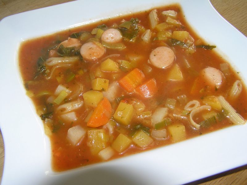 es gab suppe bzw. eintopf aus gemüsebrühe, tomatensaft, chili, lauch, steckrübe, kohlrabi, karotte, petersilienwurzel, minipenne und würstchen