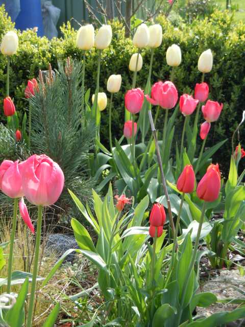 Zum Thema (zu) bunte Mischungen.Ich bin ja dazu übergegangen, bei Tulpen gern auch die Mischungen zu nehmen. In der Hoffnung, dass in der Mischung was robustes und ausdauerndes dabei ist.Hier in diesem Beispiel finde ich die Mischung gut gelungen. Im ersten Jahr nach der Pflanzung waren noch mehr Farben dabei, dann wurde es weniger. Jetzt wird es wieder mehr. Die übriggebliebenen Sorten vermehren sich.Da ist es mir auch egal, dass es feuerwehrrot ist. Frühling darf bei mir bunt sein