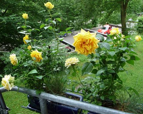 auch die Patiorosen gelb bei Schwiegermutter in den winzigen Balkonkästen sind jetzt farblich anders als beim Kauf. Sie hat da noch andere kleine Rosen in den Kästen, auch sog. Kordana, aber alle ausser den Patiorosen gelb haben Mehltau, was kein Wunder ist in diesen Gefäßen, aber um so lobenswerter, dass diese trotzdem gesundes Laub haben. Sie sind ziemlich in die Höhe geschossen.