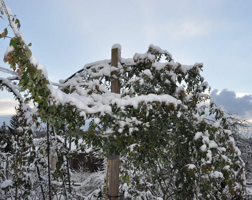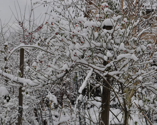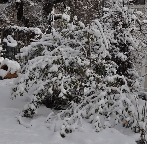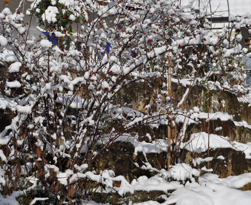Im Moment schneit es wieder da draussen.So habe ich noch ein paar Schneefotos gemacht.Und zwar ist mir aufgefallen, wieviele Rosenschneebrücken es im Garten nun hat. Ja, Rosen verbinden!