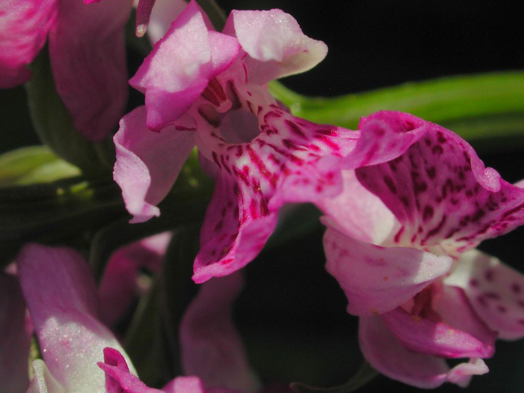 Ebenfalls im Steingarten zu Hause, aber an feuchteren Stellen, ist Dactylorhiza fuchsii, hier ein Blick aus der Perspektive eines Insekts in eine sich öffnende Blüte. Man sieht gut die Öffnung des Sporns. Solche Orchideen aus heimischen Breiten kann man mittlerweile gut aus Samen nachziehen, diese Pflanzen etablieren sich auch ziemlich gut. Die Samenkapseln werden von mir kurz vor der Reife aber abgesammelt, zum einen zum Zwecke der eigenen Vermehrung, zum anderen, um unkontrollierte Samenverbreitung auszuschließen.;)Ph.