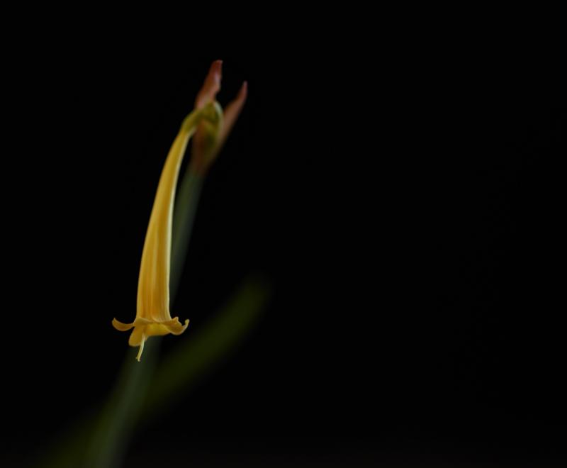 Alle Jahre wieder beginnt Sprekelia formosissima schon im blattlosen Zustand im Winterquartier zu blühen. Links ist noch der erste Blütenstengel zu erkennen, der zweite, ebenfalls schon verblühte befindet sich rechts außerhalb des Bildausschnittes, voll erblüht ist hier Nr. 3, dahinter der Stengel zur Knospe von Nr. 4, und Nr. 5 ist hier nicht erkennbar, da noch nicht aus dem Zwiebelhals herausragend.