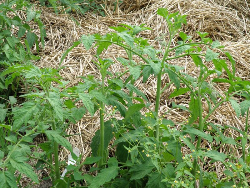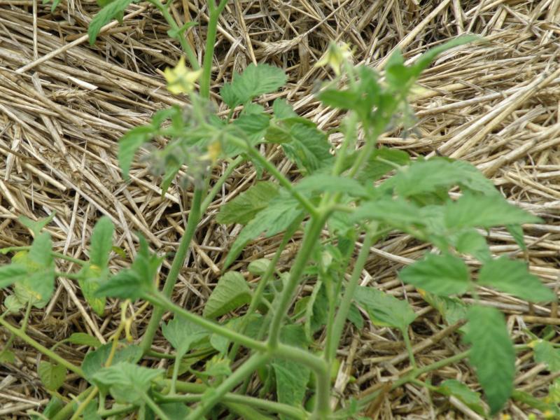 Heute habe ich bei bedecktem Himmel schnell ein paar Fotos von unserer Stroh- Tomatenversuchsfläche gemacht.