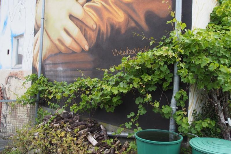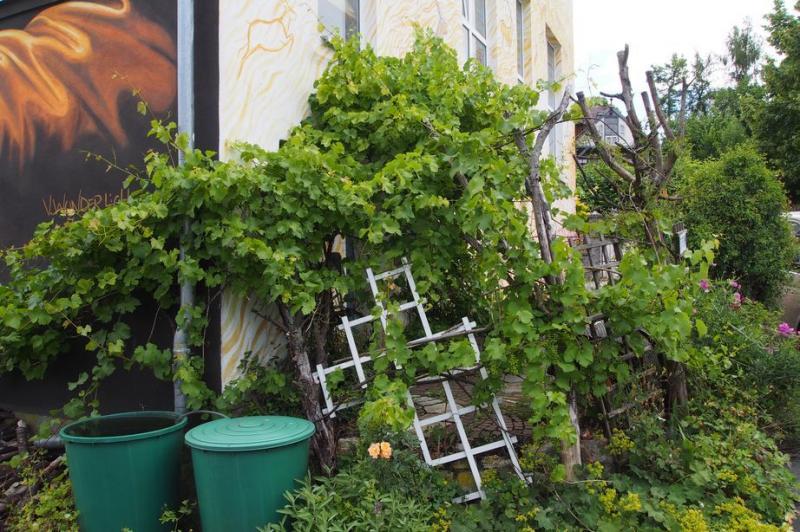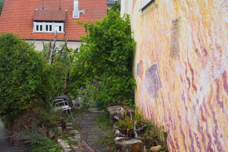 Die Situation vom gepflasterten Weg aus. Dieses Exemplar ist dieses Jahr so üppig das ich vermute da hat jemand von der Kneipe um die Ecke mal sein Geschäft erledigt.