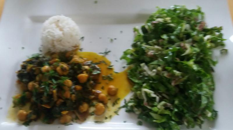 Mangold-Kicherbsen-Curry mit Kokosmilch und Basmatireis, dazu den ersten Endivien aus dem Garten mit Radicchio.