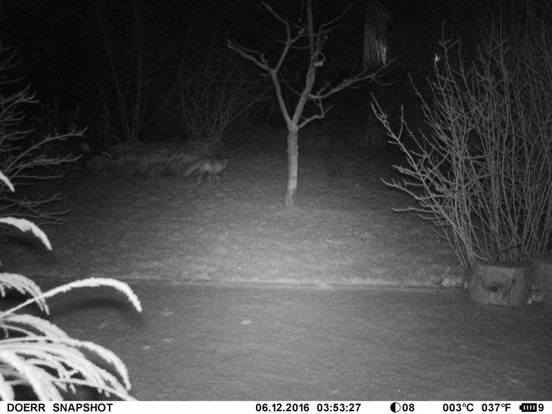 Hier hat die Wildkamera jetzt auch erstmals einen Fuchs erwischt - wie die meisten anderen Tiere schön am Rand dessen, was die Kamera so gerade noch ablichten kann. Dürften so sieben, acht Meter Entfernung sein.