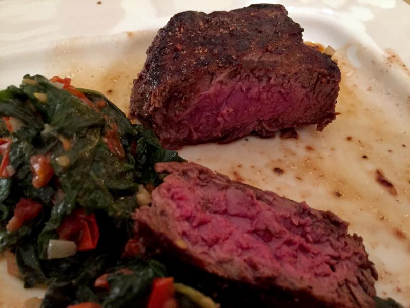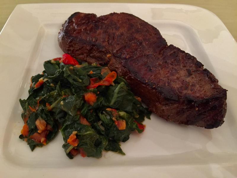 hier gab es pferde-steak mit tk-gartenmangold in üppig butter mit knoblauch, getrockneten tomaten und frischen mini-roma-tomätchen