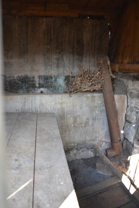 Hinten ist ein Wassersammelbecken sichtbar in dem ein Reisigbündel zum Feuer machen liegt, als wär gestern jemand da gewesen.
