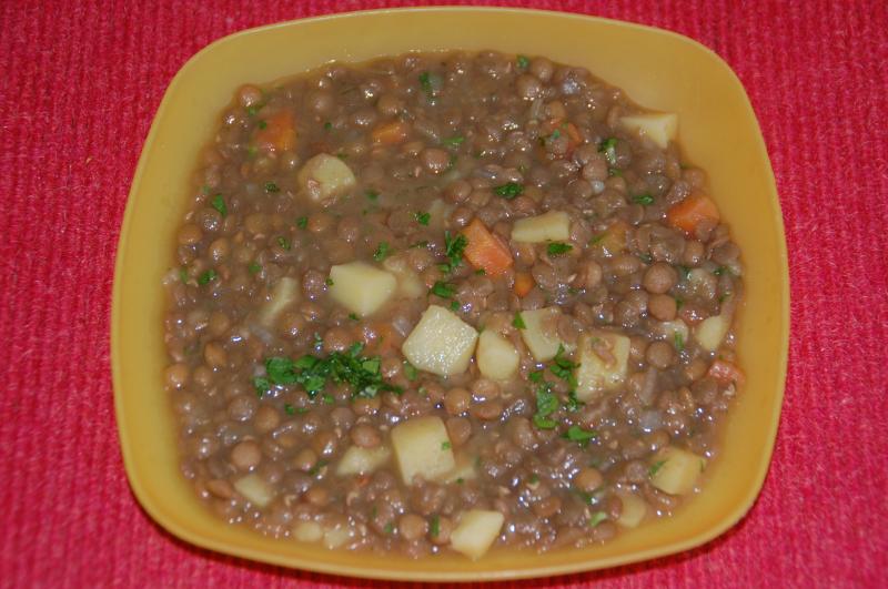 Linseneintopf (Linsen, Zwiebel, Möhre, Kartoffel, Brühe, Gänsefett, Petersilie) mit Himbeeressig