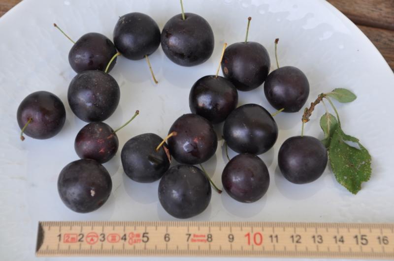 Ich gehöre auch zu denen, die Kirschpflaumen mögen. Andere finden, dass richtiges Obst ordentlich geschnitten und als Reiser veredelt sein muss. In meiner Gengend, rundum Berlin, gibt es öfters Schlehen, aber nicht so viele Kirschpflaumen. Seitdem ich eine blauschwarze gefunden habe, die ausgesprochen lecker frisch zu essen ist, bin ich ein großer Fan geworden.