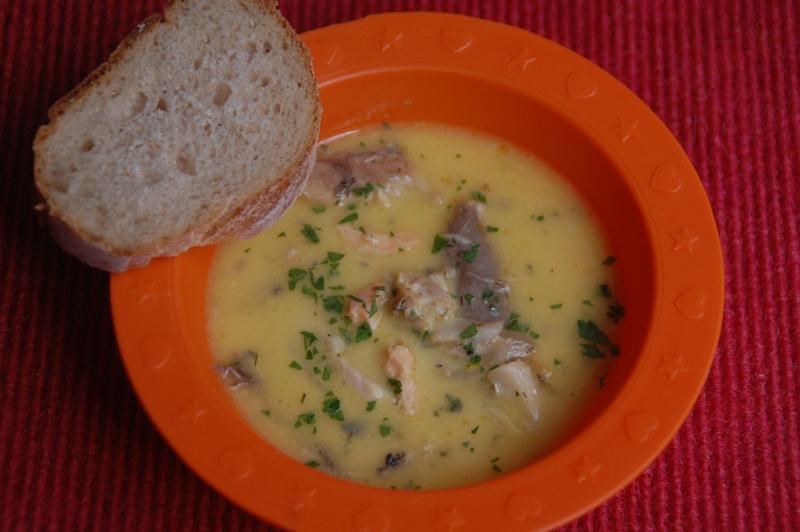Hier gab es holländische Fischsuppe (versch Fische und Fischreste, Fleischbrühe, Möhre, Porree, Schnittsellerie, Kräuterbutter, Zitrone und Zitronenschale, Pfeffer, Nelken, Eigelb, Sahne) mit Baguette.