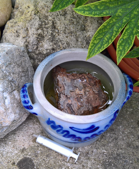Wassertankstelle, damit auch dort keins ertrinkt mit Borkenfloß. Mit der Spritze werden die Schalen befüllt.