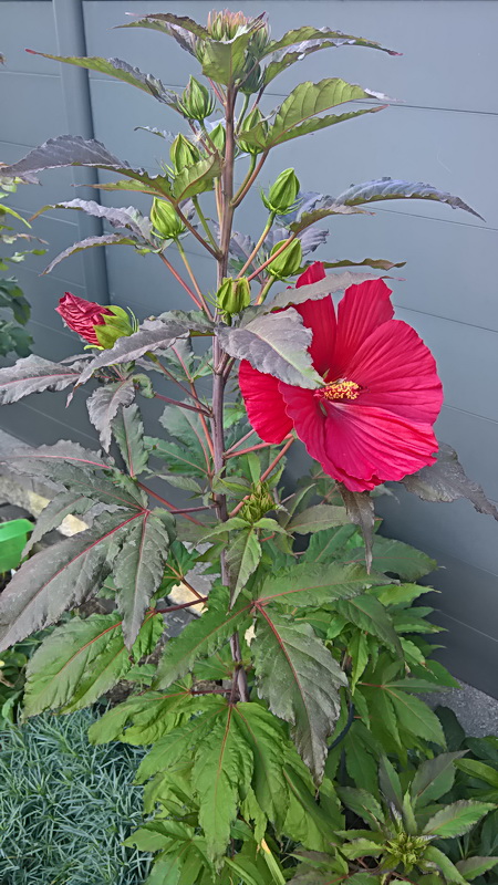 Midnight Marvel, im letzten Frühjahr gepflanzt, kommt sie schon sehr schön in die Gänge. Leider hat der zweite, allerdings lila farbene, Staudenhibiskus dieses Jahr sehr unter Schnecken zu leiden gehabt. Eine Blüte wird er nimmer ausbilden, immerhin wächst er noch.