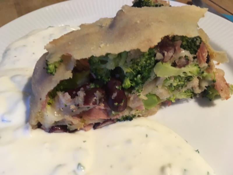 Hier war heute Strudeltag. Ich hatte drei Kinder zu bekochen, die alle verschiedenes Gemüse nicht mögen. Es wurde ein Strudel mit Broccoli, Bohnen, Schinken, Zwiebel, Knoblauch, Petersilie, Butterbrösel, Mozzarella, S&P.