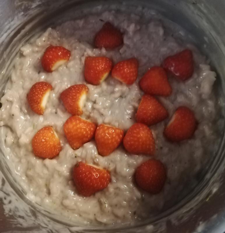 ;D Wie so häufig habe ich kombiniert. Ich habe 400g Erdbeeren genommen, 100g als Deko. 2 feingehackte Schalotten und ca. 100 g kleingeschnittene Erdbeeren in Olivenöl angedünstet, dann den Reis dazu. Abgelöscht habe ich mit 50ml Rotwein (den hatte ich schon offen). Dann den Rest der Erdbeeren dazu und wie gewohnt weiter mit Gemüsebrühe. Zum Schluss noch Parmesan und einen Schuss Sahne dazu und mit Salz und Pfeffer abgeschmeckt. Dummerweise hatte ich Basilikum vergessen. Das habe ich mit etwas Rosmarin ausgeglichen.