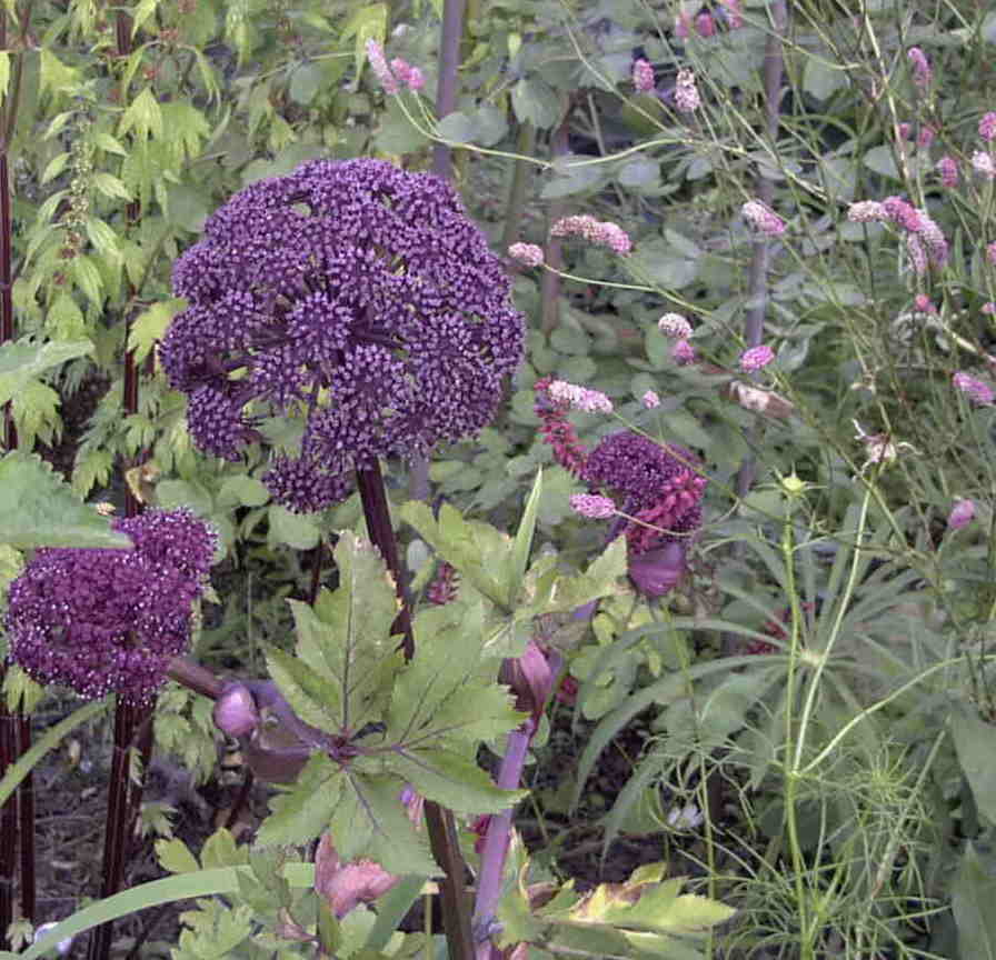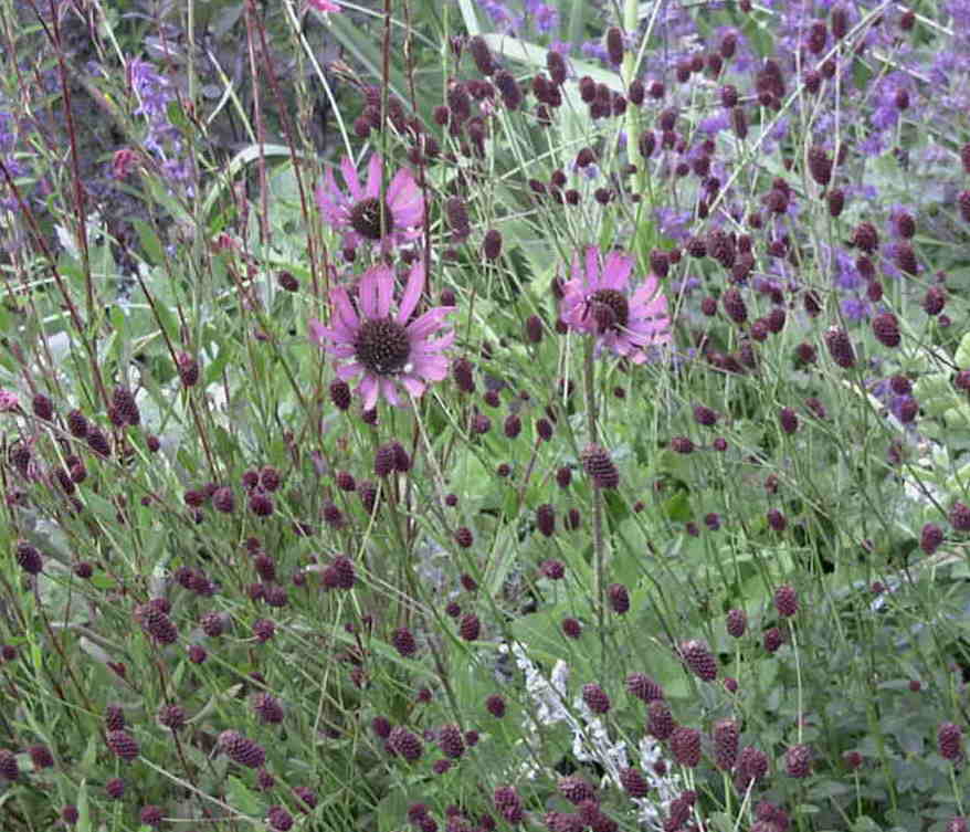Der Wiesenknopf schafft mit den Massen an dunklen Blüten eine ganz eigene Stimmung. Wuchert zwar etwas, aber Sanguisorba officinalis 'Tanna' sieht eben so schön finster aus.