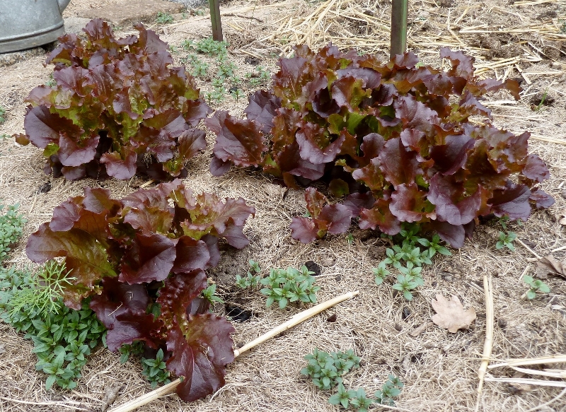 Davor wächst die erste Generation Eichlaubsalat 2021 und davor derselbe Salat Selbstaussaat 2021.
