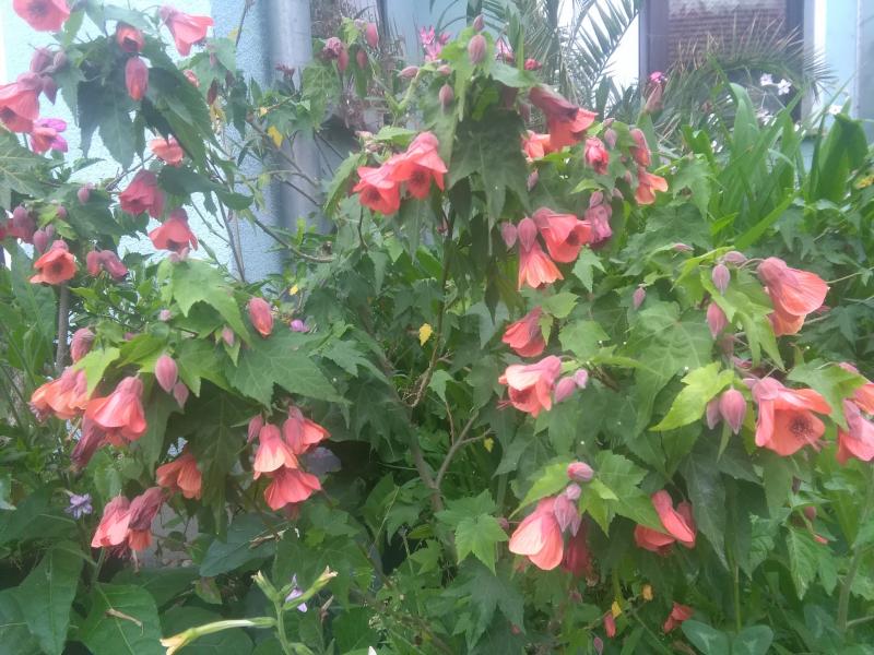 Viele Erfahrungen habe ich mit Abutilon nicht, ich habe nur die zwei. Die orange blühende ist ziemlich gagelig im Wuchs, als Kübelpflanze daher nicht ganz so einfach irgendwo einzufädeln.