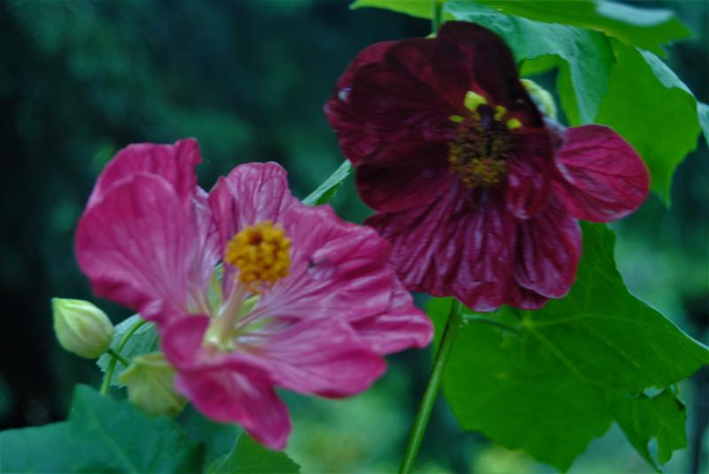 Im Hintergrund ist Abutilon 'Savitzii' zu erahnen, auch schon mit vielen Knospen besetzt.