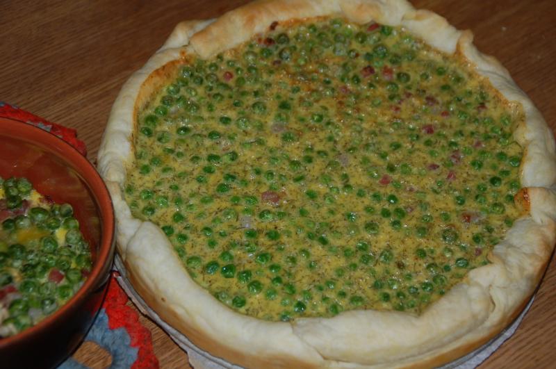 Erbsen-Schinken-Wähe (Blätterteig, Erbsen, Schinkenwürfel, Ei, Creme fraiche, Dill, Mehl, S&P)