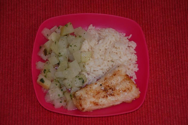 Reis, Kohlrabi (mit Butter, Gemüsebrühe und Petersilie) und gebratener Zander (mit Limette, Salz, Pfeffer, Kartoffelstärke)