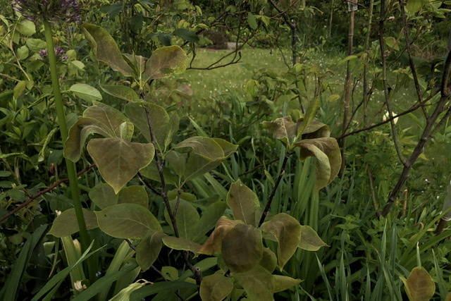 Die namenlose Magnolia soulangiana hatte der Spätfrost so erwischt, dass alles tot wirkte. Ende Mai hat sie zögerlich begonnen, wieder aus dem alten Holz auszutreiben. Jetzt blüht sie. :D