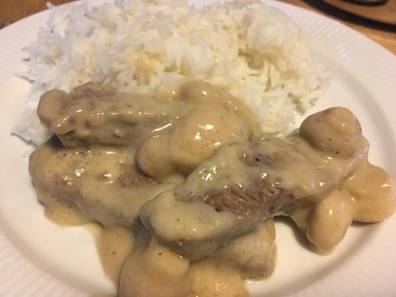 Ich hatte einen riesigen Fleischhunger und hab deswegen Rib-eye-Steak in Streifen geschnitten, kurz angebraten und mit Champignons aus dem Glas, Prosecco und Rahm kurz ziehen lassen. Das Fleisch war innen noch schön rosa. Dazu Reis und Salat. Die Vegetarierin in der Familie musste sich mit letzteren begnügen.