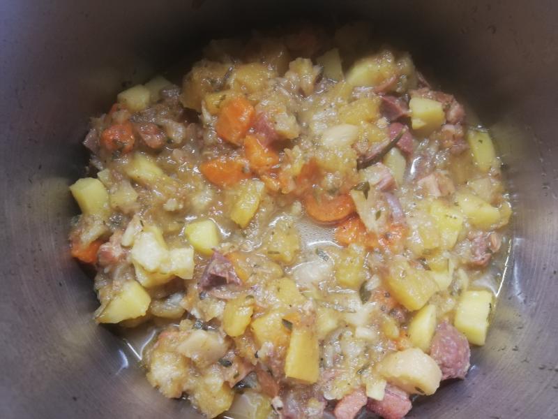 Von der Weihnachtsgans hatte ich Gänseklein beiseite gelegt, außerdem nach dem Abbeinen auch die Karkasse. Letztere kochte ist heute mehrere Stunden aus und hatte so gleich Brühe für einen Wruken-Eintopf. Er schmeckte köstlich.