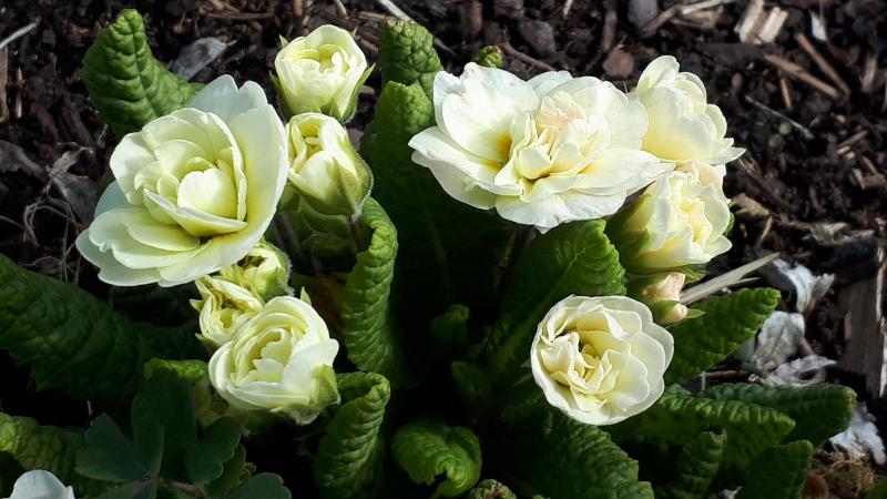 Diese grünlichgelbweißen, gefüllten Primeln halten sich hier schon seit einigen Jahren. ( Blühen jetzt noch nicht)