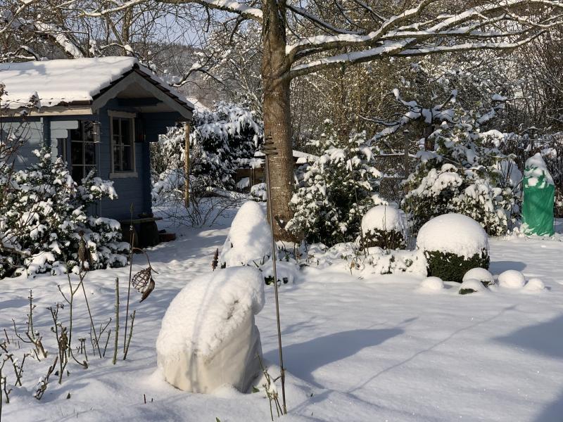 Wir scheinen Glück gehabt zu haben. Die Nacht ist bewölkt geblieben. Daher sind die Temperaturen nur auf etwa - 2 Grad runtergegangen. Die Schäden an den Pflanzen halten sich in Grenzen. Selbst die Magnolienblüte scheint nur teilweise geschädigt zu sein. Und die von mir eingepackten Pflanzen kann ich nachher alle wieder auspacken.