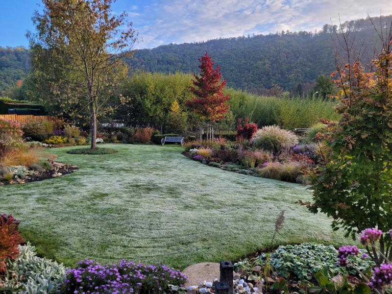 Heute morgen gab es auch hier Raureif auf dem Rasen und entsprechend kalt war es auch. Jetzt haben wir schon seit einer ganzen Zeit relativ ähnliches Wetter. Nachts ist es kalt und tagsüber setzt sich häufig die Sonne durch. Nach einem regenreichen September ist es hier doch wieder trocken. Der letzte Regen ist schon wieder bald zwei Wochen her und die Plätze unter Bäumen sind wieder verhältnismäßig trocken... und natürlich die Töpfe. Die muss ich jetzt schon wieder gießen. Ich hatte gehofft, dass das vorbei ist für dieses Jahr.