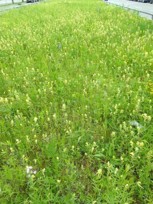 Beim Umsteigen vom Buss auf die U-Bahn kann man eine schöne Wiese mit Klappertöpfen ,Götterblumen u.a. bewundern.