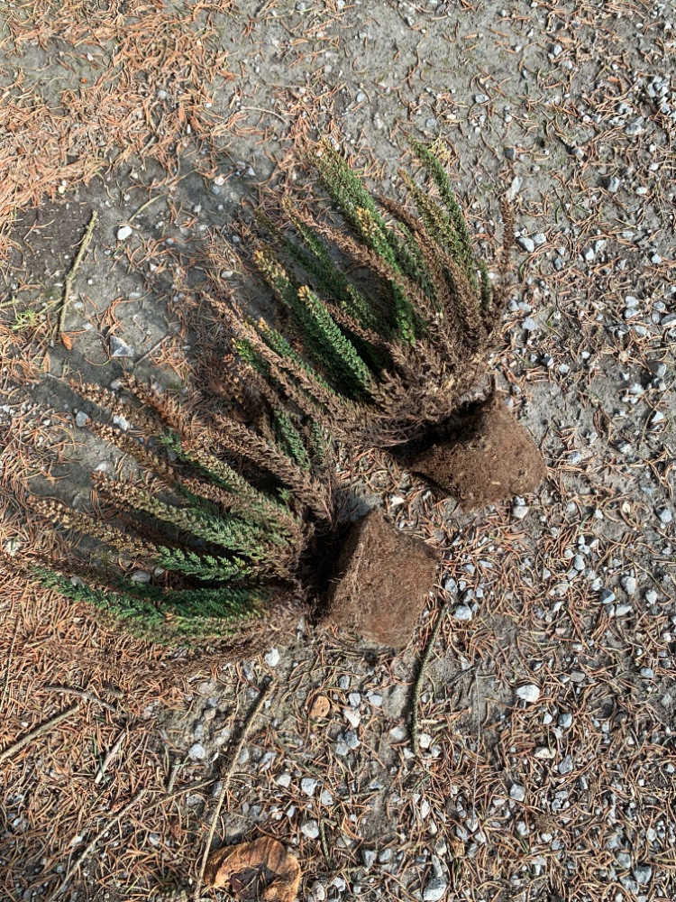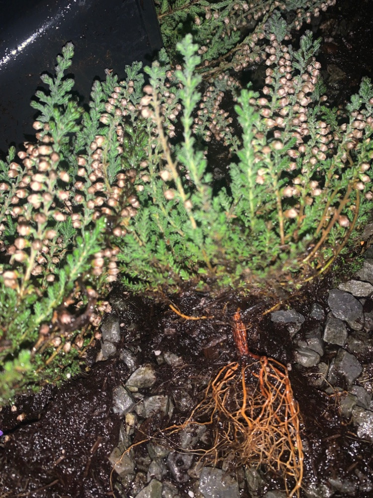 So sahen die Calluna aus als ich sie rausgeholt habe: man sieht das im Grunde garkeine Wurzeln ausgehend vom Topfsubstrat geht, man sieht hier aber nicht das hier tatsächlich aber unten ein Gutes Stückk und an den Seiten die Wurzeln angeschnitten hatte, verbraunt sind sie auch erst 8 Monate nach Pflanzung im nächsten Sommer. ABer dafür eigentlich beachtlich wie lange sie grün geblieben sind