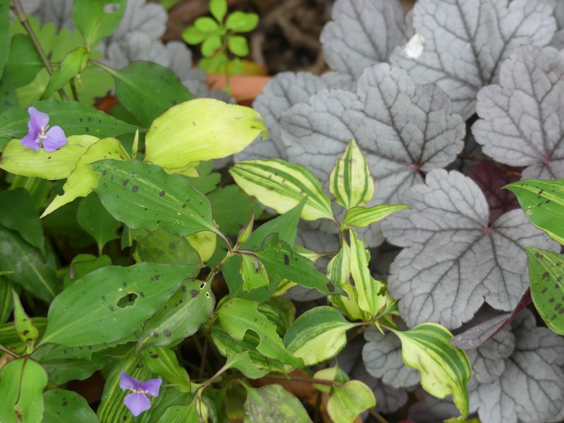 Spätblühende Oxalis lasiandra mit Hosta und Fugensämling Tinantia