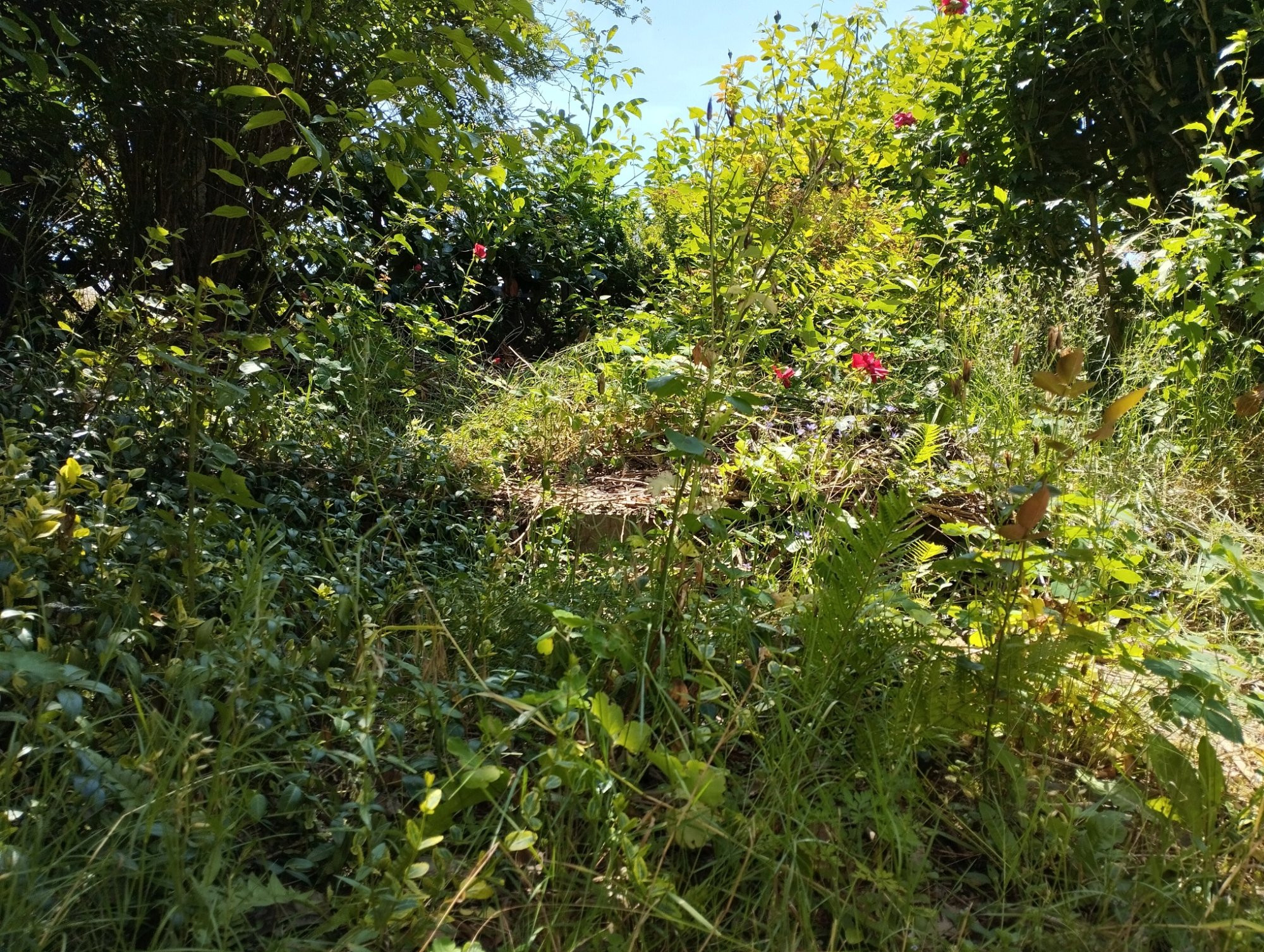Aber klar, da sind vor allem von links und rechts Buesche eingewachsen (links ein 6m hoher Flieder, und von rechts der Hibiskus und ein Japanischer Spierstrauch mit noch einem anderen Busch innen drin. Die Eiche ist auch schon recht gut gewachsen. Was mittlerweile verschwunden ist, ist die Bedeckung durch die Lorbeerkirschen und der riesige Ginster, der bis an den Weg stand. Was immer noch drin ist: das war mal ein Steingarten, und die grossen Steine sind immer noch in der Erde.