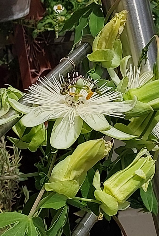 Hier blüht eine schöne, ganz weisse Passiflora. Ich dachte, sie sei erfroren. Ein Teilchen scheint sich berappelt zu haben und blüht. Leider ein Spielgarten für eine Ameisenhorde.