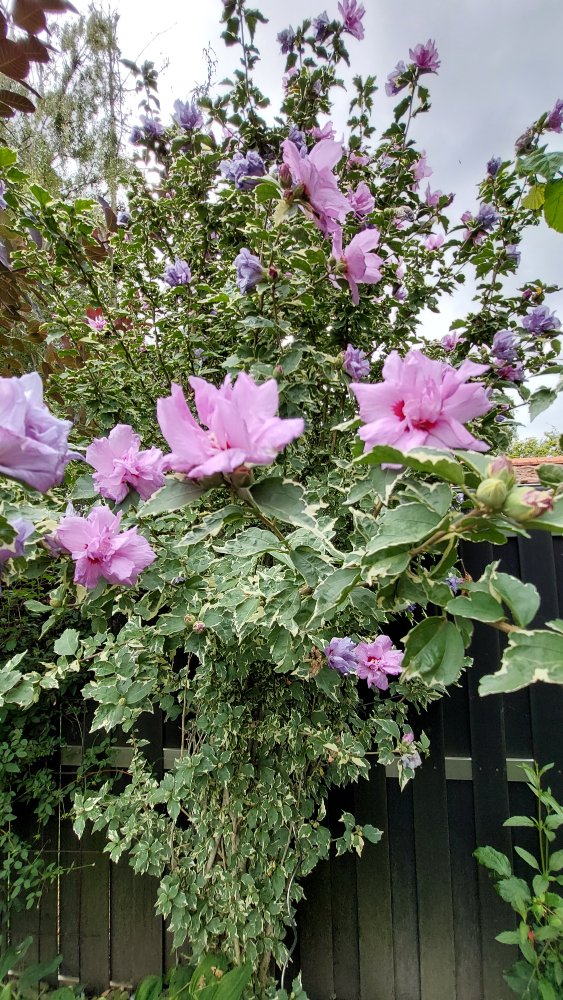 Danke, riegelrot! Hibiscus syriacus ´Speciosus´ kenne ich nur von Fotos, die Blüten erscheinen mir aber nicht so flach und groß, auch unruhiger in der Füllung. Hier mal eine Nahaufnahme. Aber vielleicht ist es doch diese Sorte? Der Strauch ist recht zügig schmal in die Höhe gewachsen und jetzt über 3 m hoch.